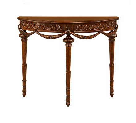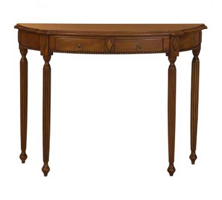 Стол-консоль станет необыкновенным украшением интерьера Вашей гостиной, спальни или кабинета, помимо этого он функционален. Фабрика «Satin Furniture» представляет мебель для жилых помещений выполненную в классическом стиле. Ассортимент включает в себя мебель для сидения, столовых и гостиных, кабинеты и множество аксессуаров. Данная продукция полностью выполнена из массива гивеи-махагонь (красного дерева ). Все элементы мебели обрабатываются вручную. Удачно подобран цвет лакокрасочного покрытия орех («New Antique»). Покрасочные материалы были разработаны бельгийскими  специалистами и поставляются непосредственно из Европы. Мебель поставляется из Индонезии в собранном виде. Для соединения деталей в производстве используются винтовые и шкантовые (шкант-чепики) соединения, также при сборки мелких частей – клеевые соединения.