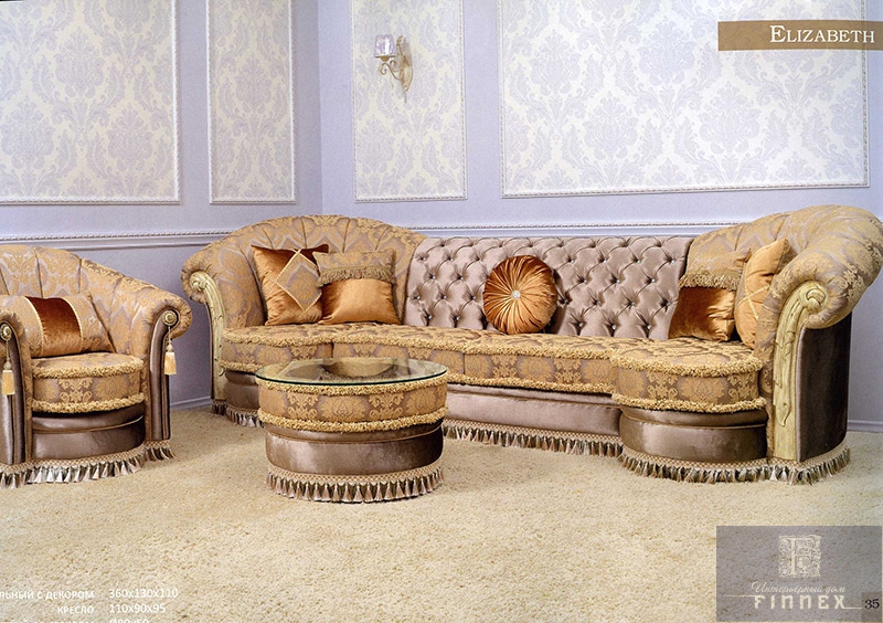 Elizabeth — диван модульный 360×130×110, кресло110×90×95, пуф со стеклом , диаметр 80×50 Изысканный бордовый цвет с золотой отделкой. Каркас натуральное дерево. Различные варианты тканей обивки. Диван и кресла в дворцовом стиле от одного из лучших производителя России. Комфортная мягкая мебель в классическом итальянском стиле. Большой выбор обивочных тканей.